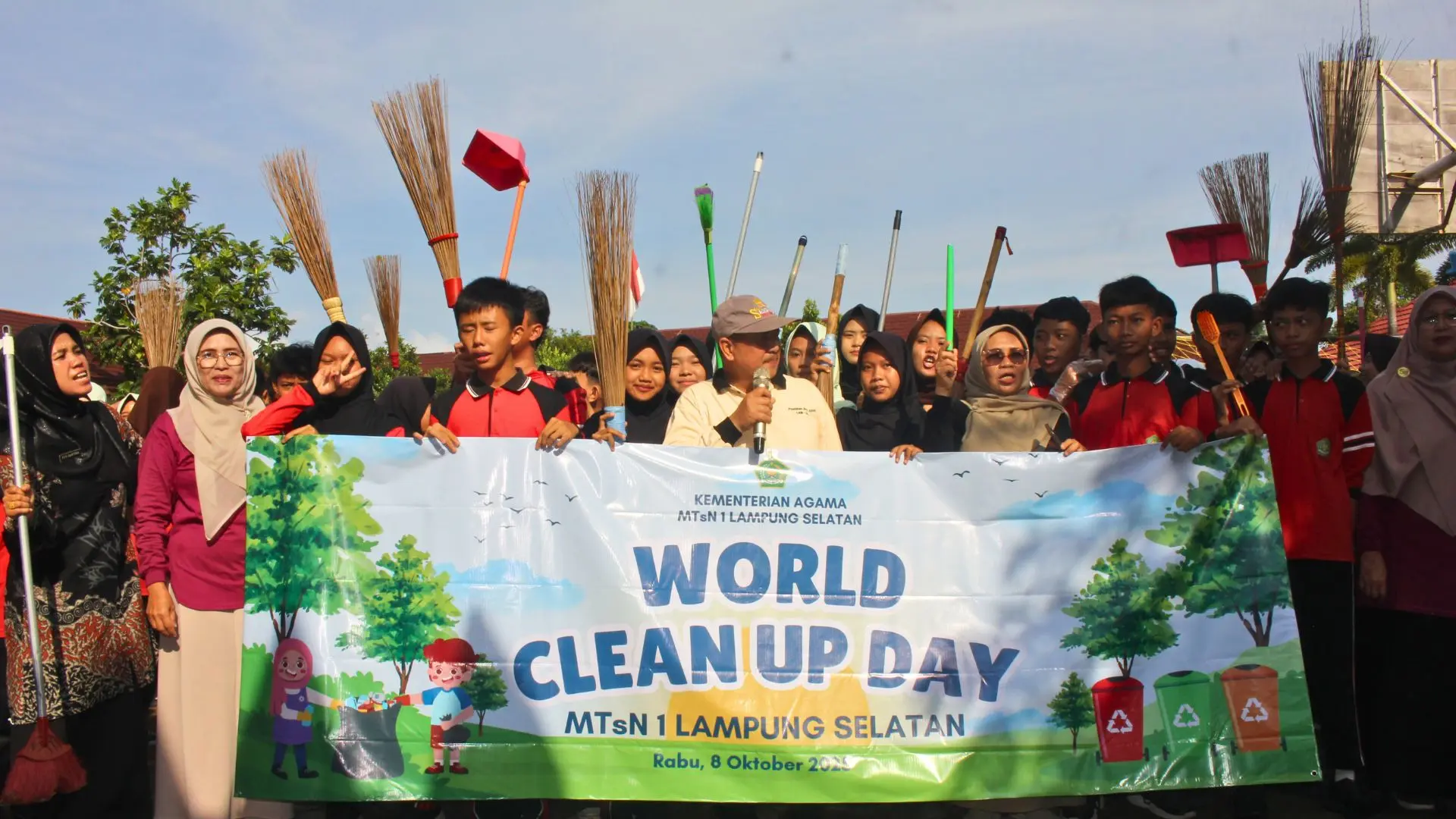 Lampung Selatan, MTsN 1 (Humas) – Pemandangan berbeda tersaji di MTsN 1 Lampung Selatan pada Rabu pagi, 8 Oktober 2025. Ratusan siswa dari kelas 7, 8, dan 9 tidak hanya datang membawa buku, tetapi juga lengkap dengan sapu, serok, dan kantong sampah. Dengan semangat membara, mereka bersatu dalam sebuah gerakan kolosal bertajuk "Aksi Nyata Madrasahku: Bergerak Bersama untuk Bumi" untuk memperingati World Cleanup Day (WCD) 2025.