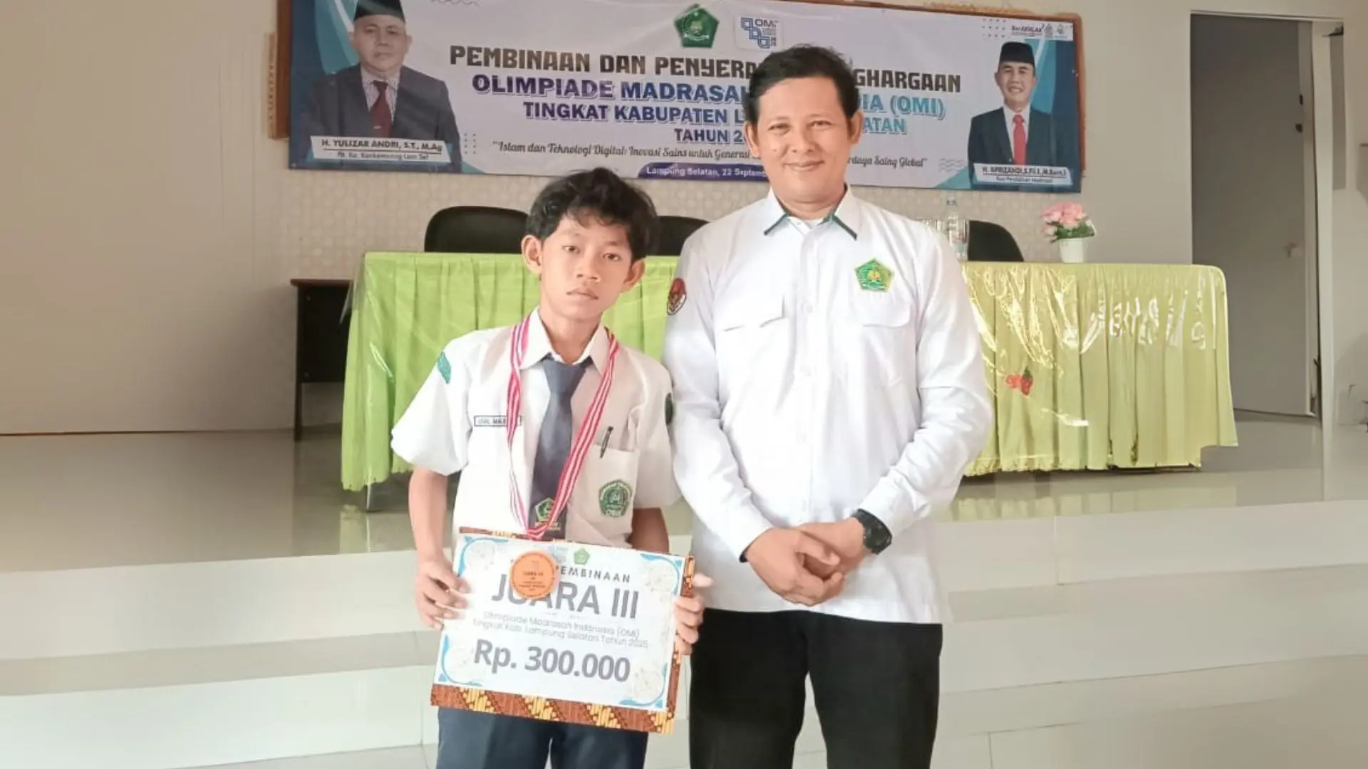 Lampung Selatan, MTsN 1 (Humas) - Kementerian Agama (Kemenag) Kabupaten Lampung Selatan telah sukses menyelenggarakan ajang bergengsi Olimpiade Madrasah Indonesia (OMI) Tingkat Kabupaten pada hari Senin, 22 September 2025. Acara yang digelar di aula kantor Kemenag ini menjadi bukti nyata integrasi antara mata pelajaran umum dan agama dalam sebuah kompetisi yang sehat dan membangun. Salah satu prestasi gemilang diraih oleh Akmal Maulana, siswa kelas 9B dari MTsN 1 Lampung Selatan, yang berhasil merebut juara 3 dalam cabang lomba Sains IPS.