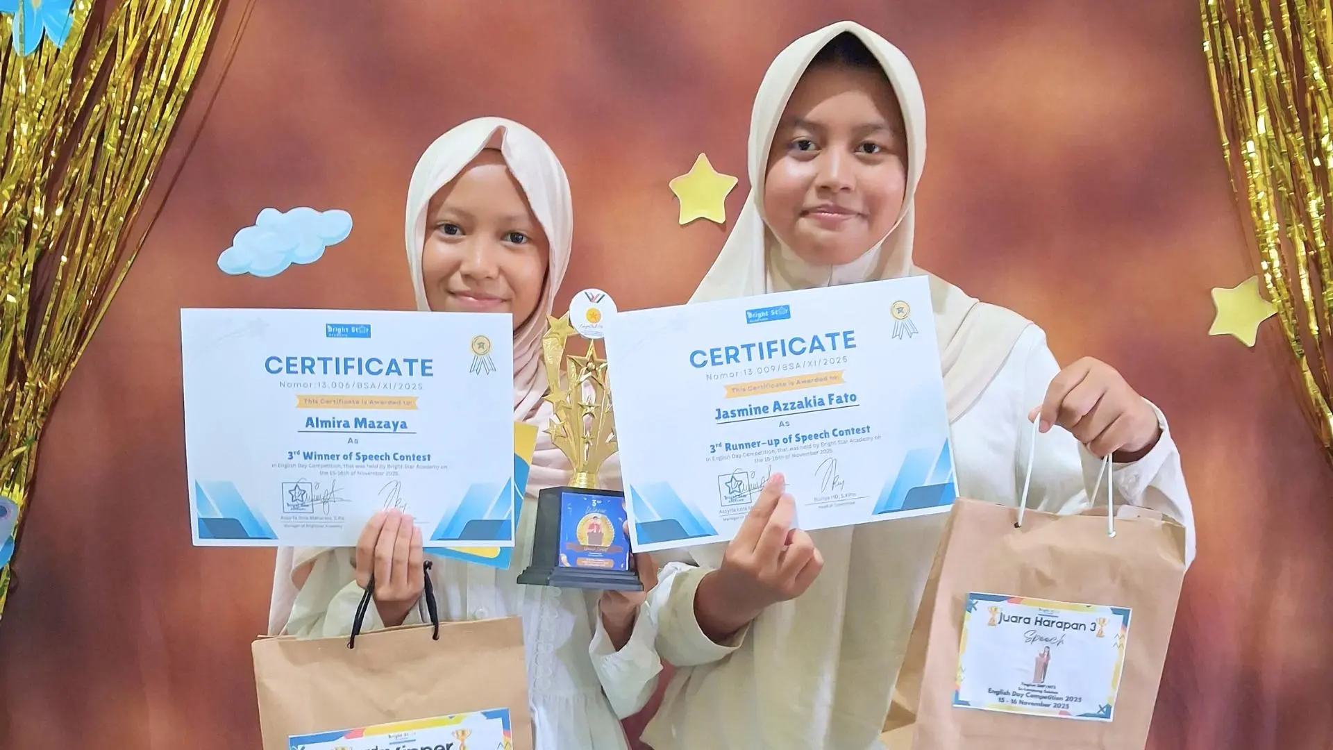 Lampung Selatan, MTsN 1 (Humas) – Prestasi membanggakan kembali diukir oleh peserta didik MTsN 1 Lampung Selatan. Kali ini giliran Almira Mazaya dan Jasmine Azzakia Fato, siswi kelas 8B, yang berhasil meraih Juara 3 dan harapan 3 dalam lomba pidato Bahasa Inggris (Speech Contest) yang diselenggarakan oleh Bright Star Academy. Kompetisi tersebut berlangsung pada Sabtu (15/11/2025) bertempat di LKP DCC Kalianda, Lampung Selatan. Almira sukses menyisihkan pesaingnya dan tampil percaya diri di hadapan dewan juri.